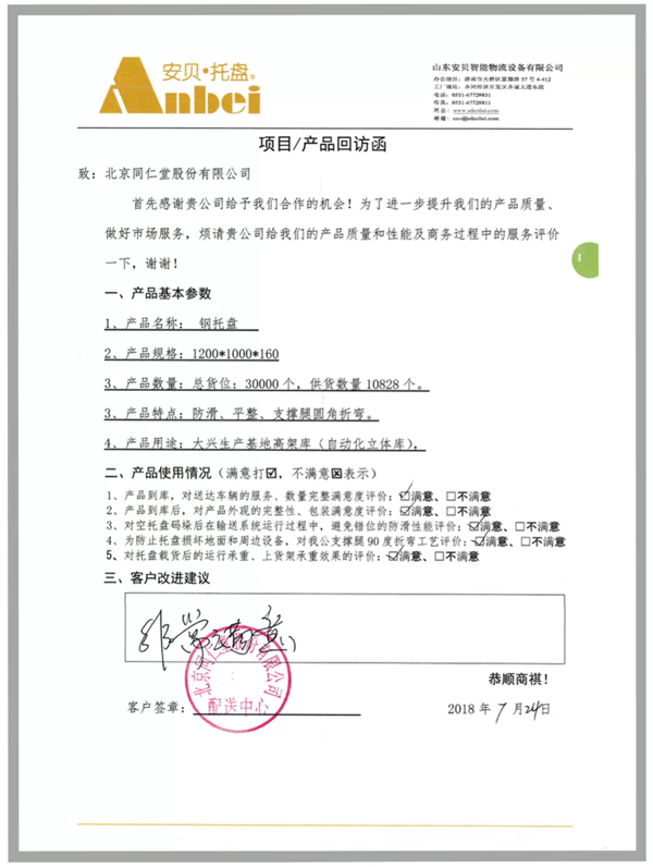 安貝為北京同仁堂藥業立體庫項目的30000個貨位配套了鋼托盤產品,得到了北京同仁堂領導的高度評價