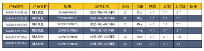 四向三腿——鋼木托盤 技術參數說明: 產品編號: AATJD4ⅢY1212165 產品規格: 1200*1200*165 產品自重: 45kg 防銹工藝: 靜電沙紋噴塑 產品靜載: 3000KG(均勻載重) 產品動載: 2500KG(均勻載重) 產品上架: 1500KG(均勻載重) 主要用途: 倉庫、車間周轉、高庫物流倉儲