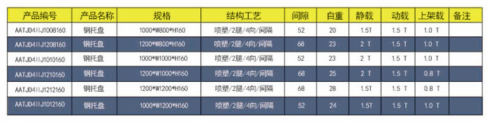 四向二腿——CM形深槽面鋼托盤 技術參數說明: 產品編號: AATJD4ⅡJ1212160 產品名稱:CM面鋼托盤(深槽,間隔鋪面) 產品規格: 1200*1200*160 防銹工藝: 靜電沙紋噴塑 產品靜載: 1500KG(均勻載重) 產品動載: 1500KG(均勻載重) 產品上架: 1000KG (均勻載重) 主要用途: 倉庫、車間周轉、物流倉儲